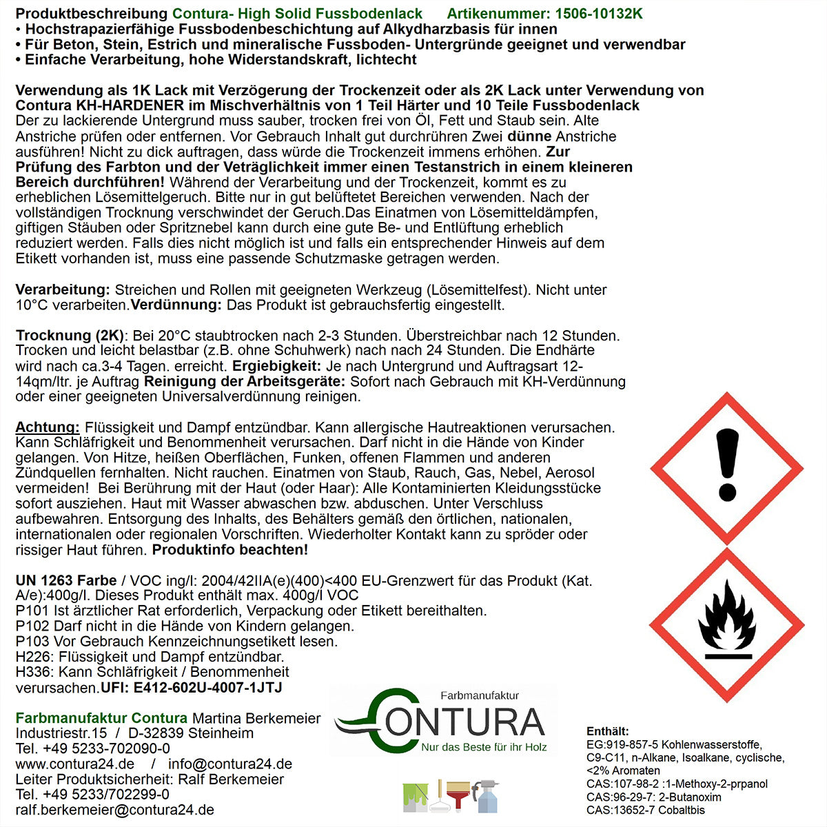 Die CONTURA 2K Premium Fußbodenbeschichtung ist eine extrem belastbare, seidenmatte Urethanalkydharz- Lackfarbe für den Innen- und Außenbereich geeignet. Diese Bodenfarbe basiert auf Uretanalkyd und weist dadurch hervorragende Eigenschaften auf. Abweisend gegen Wasser, kratzfest, schlagfest, wetterbeständig, Beständigkeit gegen Abrieb, sehr ergiebig, gut und glatt verlaufend. Die Lieferung erfolgt als Set (Lack mit Härter).