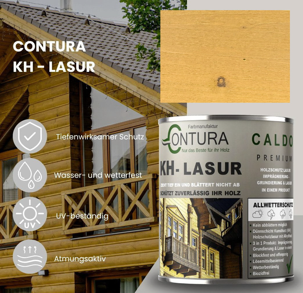 Contura KH Holzlasur ist eine hochwertige und sehr ergiebige, anwendungsfreundliche sowie offenporige Holzlasur in 14 Farbtönen mit Langzeitschutz aus der traditionellen Contura Farbmanufaktur. Angesagte Holzlasur Farbtöne für eine gelungene, lasierende Holzgestaltung. Neu und völlig im Trend sind die "Longterm Grey Protection", grauen Farbtöne aus der Farbauswahl. Die lösemittelhaltige Dünnschicht- Holzlasur dringt gut und tief in das Holz ein und wirkt wasserabweisend, feuchte regulierend und hochgradig wetterbeständig. Die Lasur blättert nicht ab und kann somit, auch nach Jahren, einfach übergestrichen oder mit einem dünnen Anstrich (ohne schleifen) nachgepflegt werden. Geben Sie Ihrem Holz im Außenbereich mit dieser Lasur einen zuverlässigen, langanhaltenden Schutz und lassen Sie Ihr Holz zum Hingucker im Garten werden.