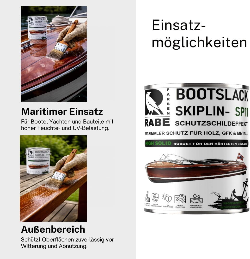 SKIPLIN SP11 von Farben Rabe ist genau dafür gemacht. Ein urethanverstärkter Alkydharz-Bootslack in echter Industriequalität, der dort eingesetzt wird, wo Fehler keine Option sind – in kleinen Werften, draußen im Wind, im Wasser, im Salz. Sein Geheimnis liegt im hohen Festkörperanteil (High Solid): weniger Lösungsmittel, mehr Substanz, mehr Schutz. SKIPLIN SP11 legt sich wie ein Schutzschild über Holz und Metall und bewahrt sie zuverlässig vor Witterung, Feuchtigkeit und täglicher Belastung – Jahr für Jahr.