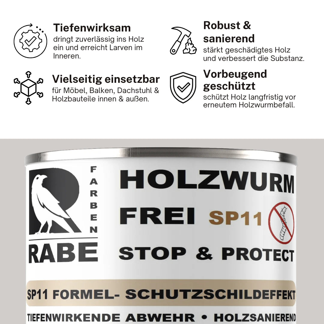 Holzwürmer können Holzbauteile, Möbel und Konstruktionen dauerhaft schädigen – oft bleibt der Befall lange unbemerkt. Farben Rabe Holzwurmfrei SP11 – Stop & Protect ist die zuverlässige Lösung, wenn du Holz schützen, festigen und einem erneuten Befall wirksam vorbeugen möchtest.